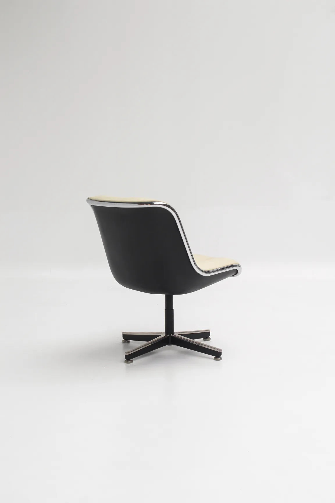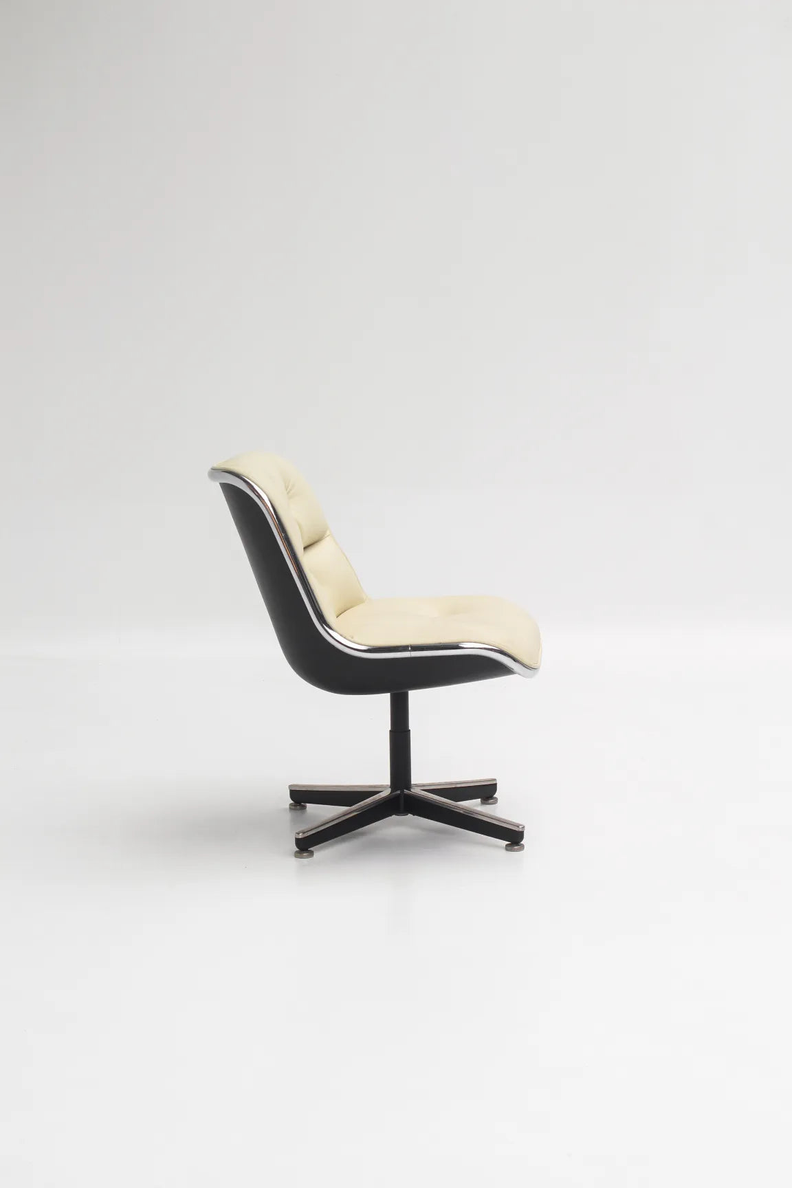 Icône du mid-century américain, ce fauteuil marie une assise généreuse capitonnée en cuir blanc crème à une coque galbée parfaitement dessinée pour épouser le corps.
